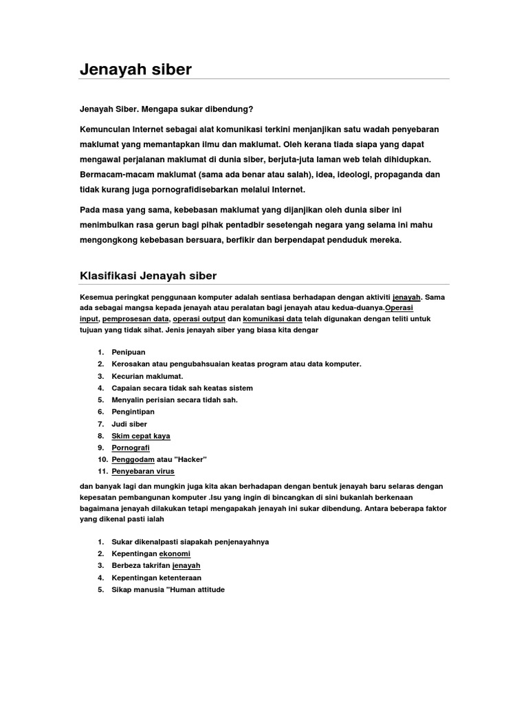 Kesan kesan jenayah siberantara kesan berlakunya jenayah siber di malaysia adalah maklumat peribadi kita atau sulit terdedah. Menurut keratan akhbar berita harian, yang bertajuk ramai tidak peka risiko jenayah siber menyatakan nisbah kebarangkalian jenayah siber berlaku kini pada tahap 1. Jenayah siber, apa punca sebenar? Makalah sejarah sebelum berlakunya uupa.docx. Ada pihak mendakwa polis diraja malaysia (pdrm) adalah punca berlakunya jenayah di negara ini. Pada masa kini, terdapat pelbagai ict digunakan seperti computer, telefon bimbit yang bercanggih dan sebagainya. Punca pertama ialah kurang didikan agama. Oleh kerana tiada siapa yang dapat mengawal perjalananmaklumat di dunia siber. Mengkaji punca sebenar berlakunya jenayah siber. Agama dapat menghalang seseorang daripada melakukan. Jenayah siber merupakan jenayah komputer yang baharu pada abad ini. Mengikut istilahnya, jenayah siber merujuk kepada perbuatan atau insiden yang dilakukan di alam siber, sama ada menggunakan komputer mahupun peralatan seperti perkakasan dan perisian husin memberitahu, terdapat beberapa punca atau sebab berlakunya peningkatan insiden tersebut. Memperkasa badan koordinasi seperti agensi keselamatan siber negara (nacsa), pusat jenayah kewangan kebangsaan (nfcc), dengan memberikan punca kuasa kepada mereka seperti.