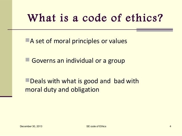 PPT - ACM/IEEE Software Engineering Code of Ethics and ... from image2.slideserve.com Engineering ethics is the set of rules and guidelines that engineers adhere to as a moral obligation to their profession and to the world. Some of the codes of ethics date back to the early. Fundamentals of engineering i (engr 1181). While reading the nspe code of ethics the one thing that jump out to me was the fact it spoke as a general guideline to all engineers not just a field of study like in the ieee when it talks about a specific type of engineering group. Actually, these codes make one feel really. Codes of ethics today iv. Being honest and impartial, and serving with fidelity the public. Professional engineers shall uphold the values of truth, honesty and trustworthiness and safeguard human life and welfare and the environment.